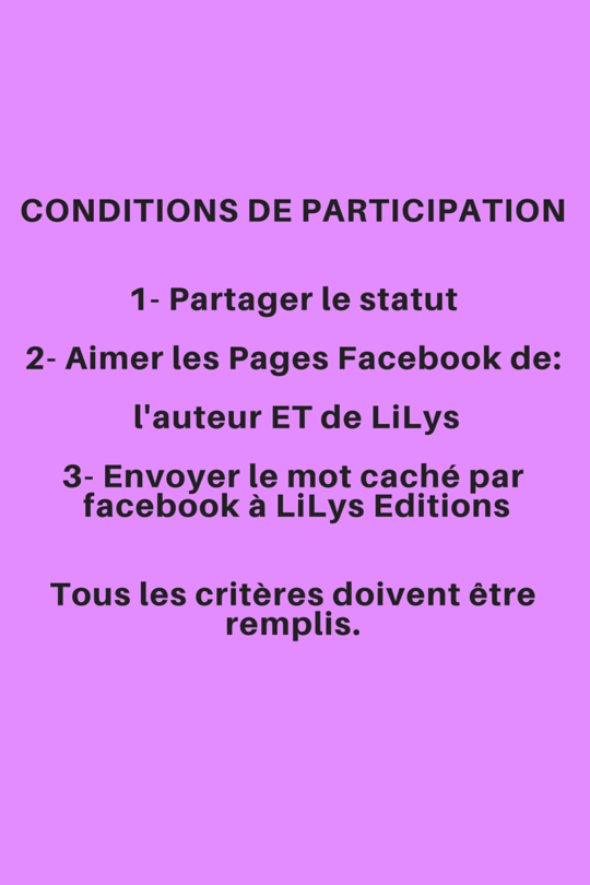 Publié le 1 juin 2016 par Lily Partager le statutAimer la Page Facebook de l’auteur ET celle de LiLysEnvoyer le mot caché par mail à LiLysEditions.contact@gmail.com