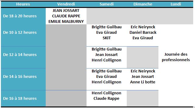 Pour mieux vous y retrouver, voici un tableau des dédicaces prévues :