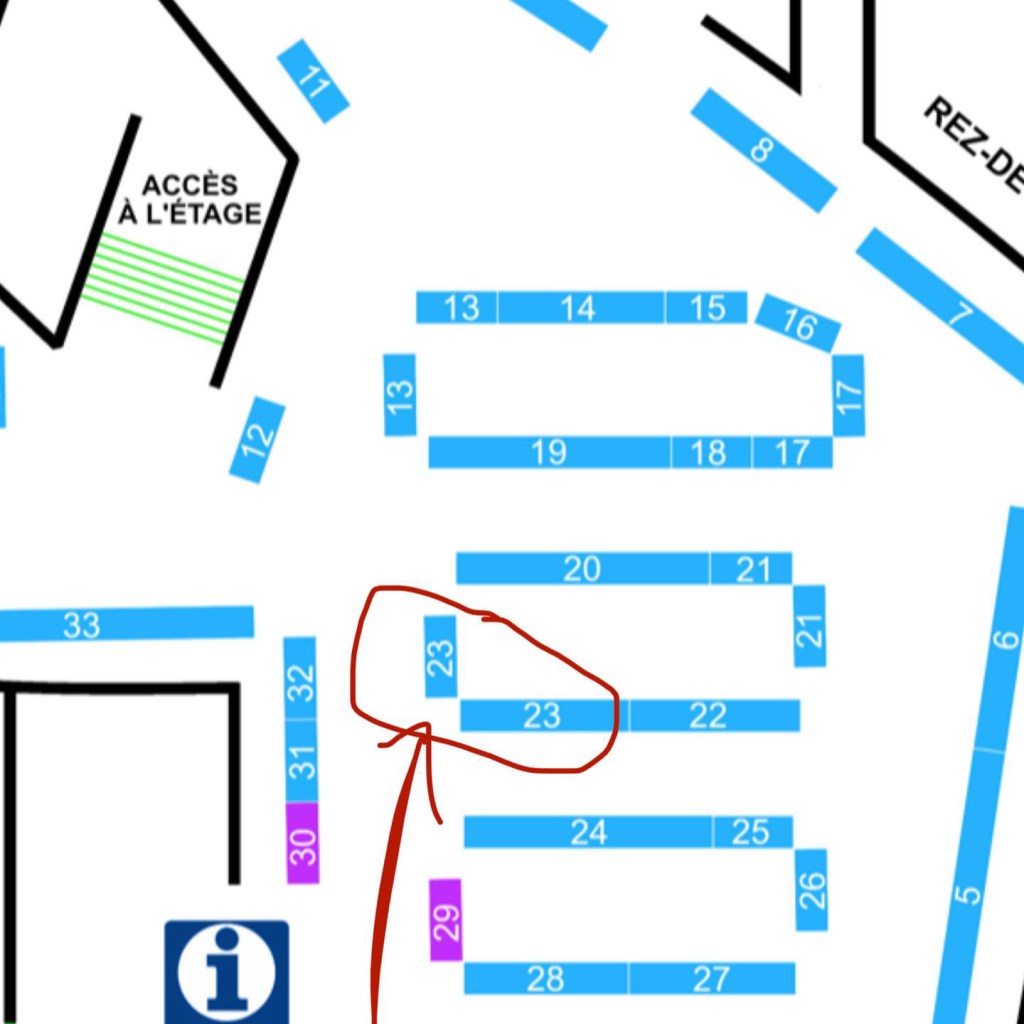 Notre stand se trouvera (voir le plan ci-dessous) au numéro 23, pas très loin de l’entrée au rez-de-chaussée où vous pourrez discuter avec nos auteurs et autrice et découvrir notre catalogue complet tel que « Seule ma mère comprenait » de Dominique Delescaille, les « Electropismes » et « Mille neuf cent soixante-quatre et demi » de Samuel Bury, « L’Affaire Boris » et « Isobel_2172 » de Frédéric Beth et l’incontournable « Viande » de Noëlle Michel.
