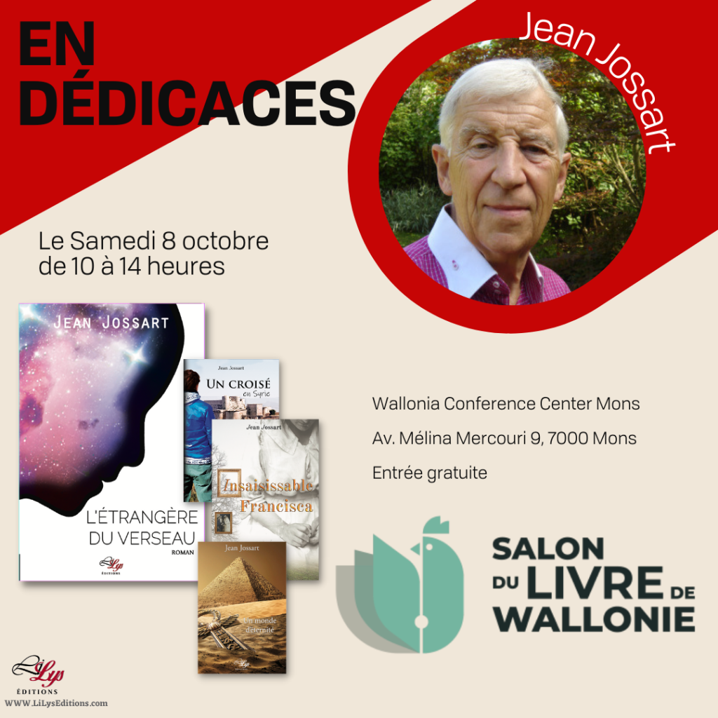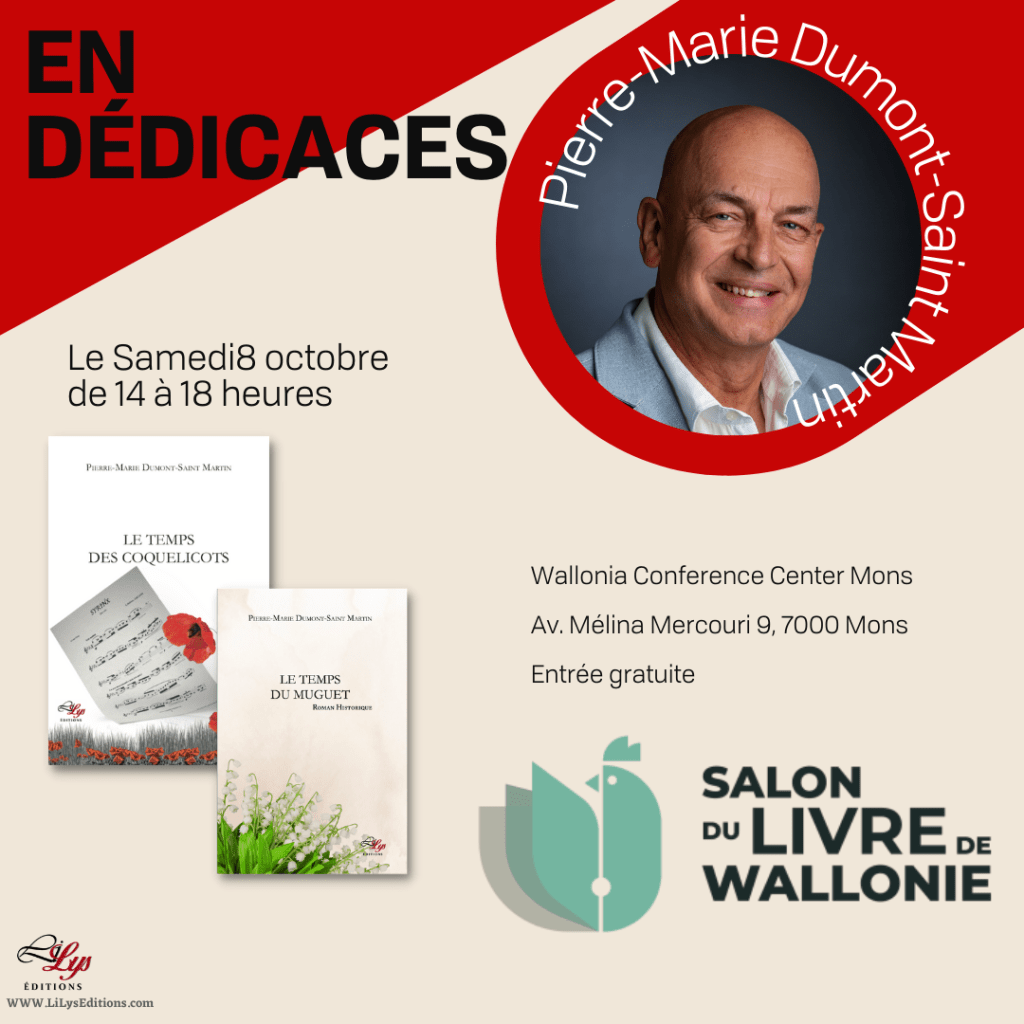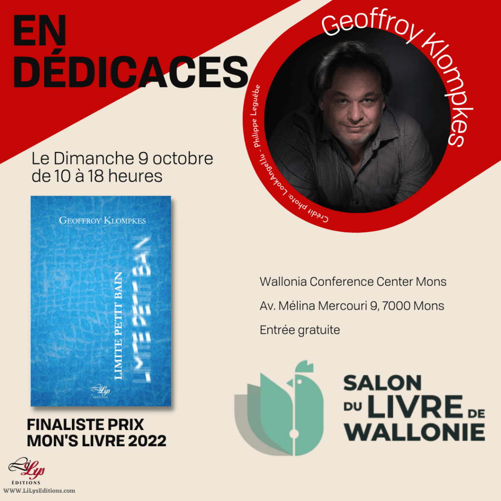 Adresse: WCCM – Salon du livre de Wallonie – avenue Mélina Mercuri, 9, 7000 Mons ( à côté du Van Der Valk). Ouverture du salon les 8 et 9 octobre de 10 à 18 heures