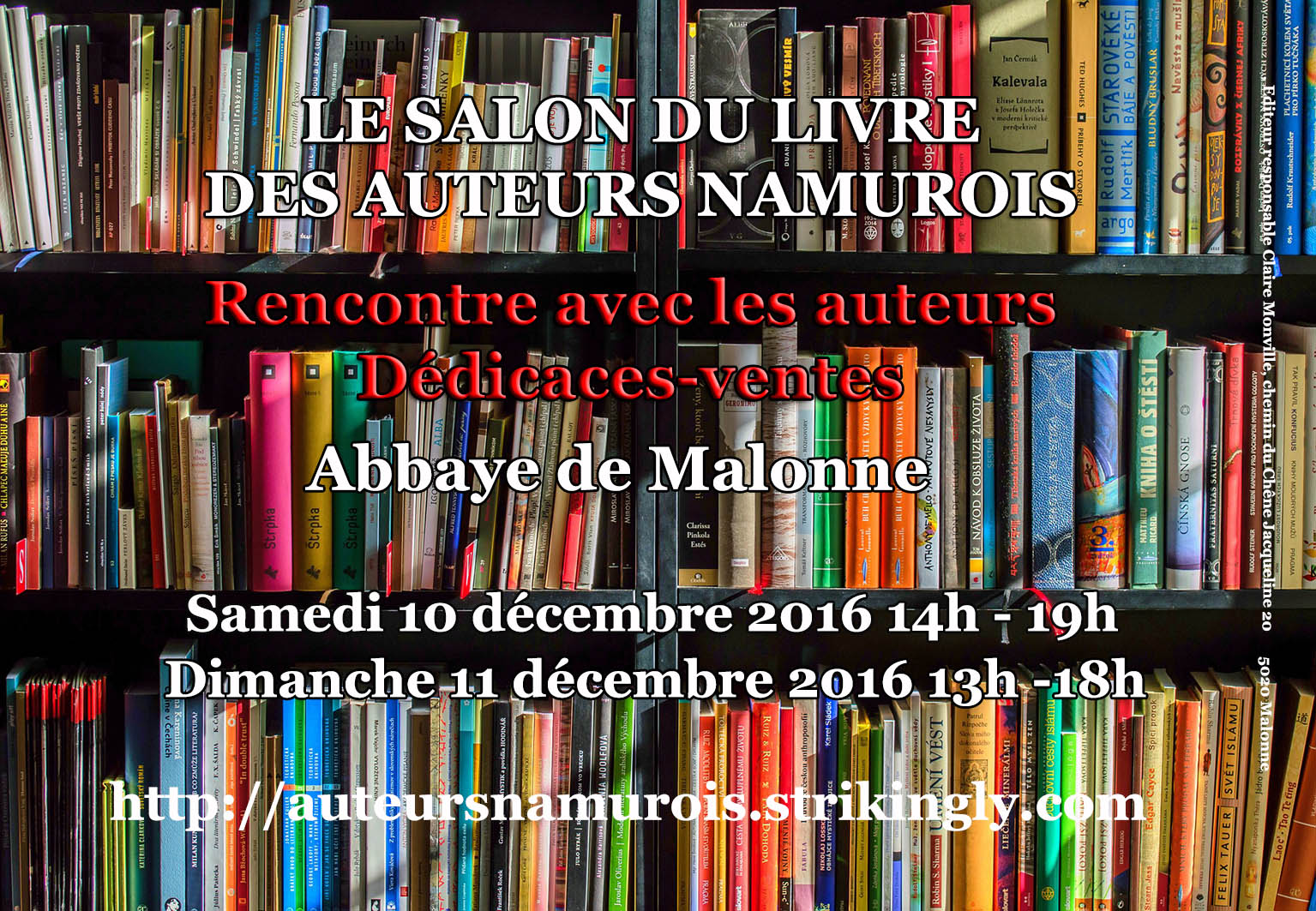 Les 10 et 11 décembre, Brigitte Guilbau sera au salon des auteurs namurois organisé à l’Abbaye de Malonne en collaboration avec la librairie Papyrus de Namur.